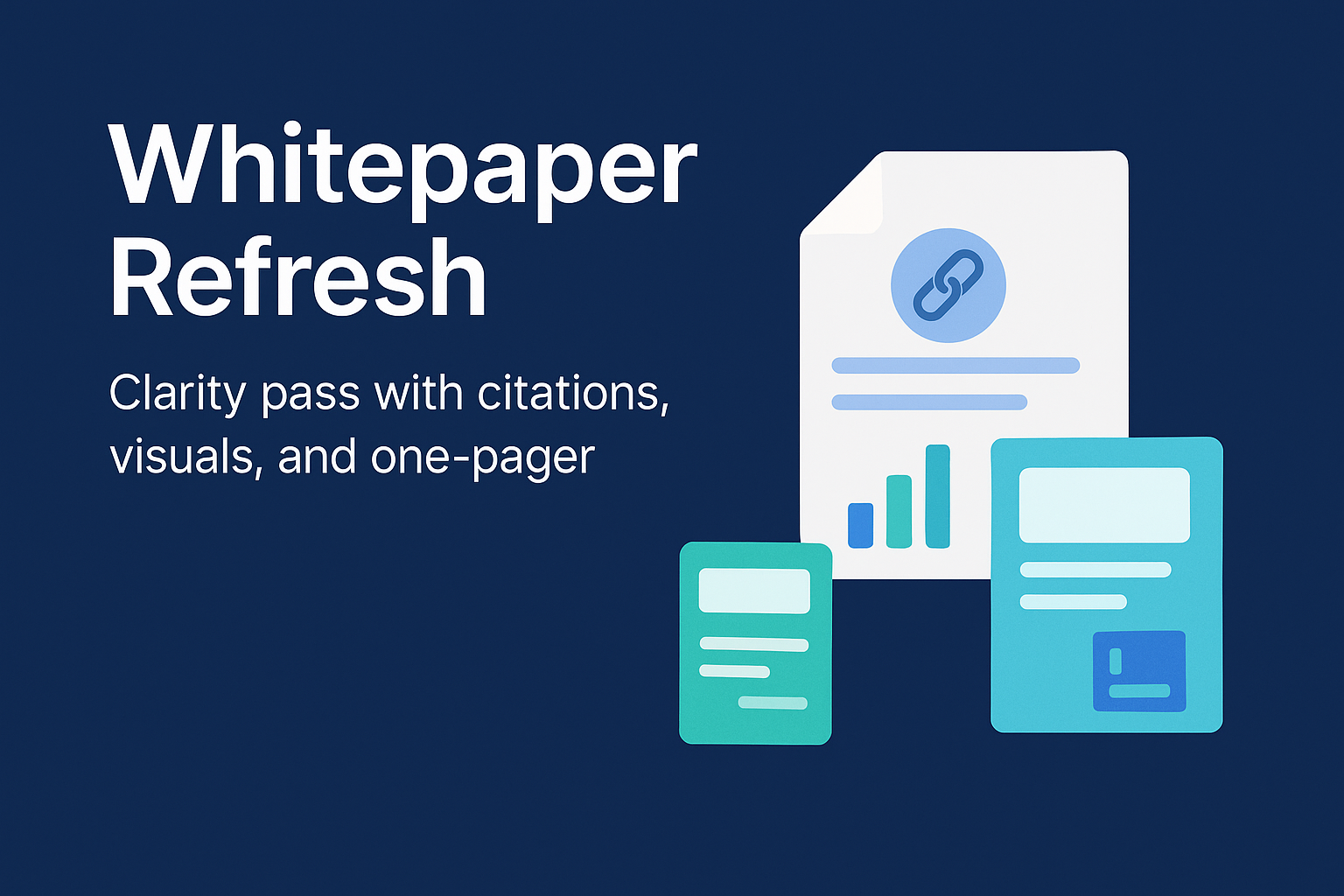 Outline, drafting, proofreading, citations, and visual aids. One‑pager, litepaper, and full whitepaper support.